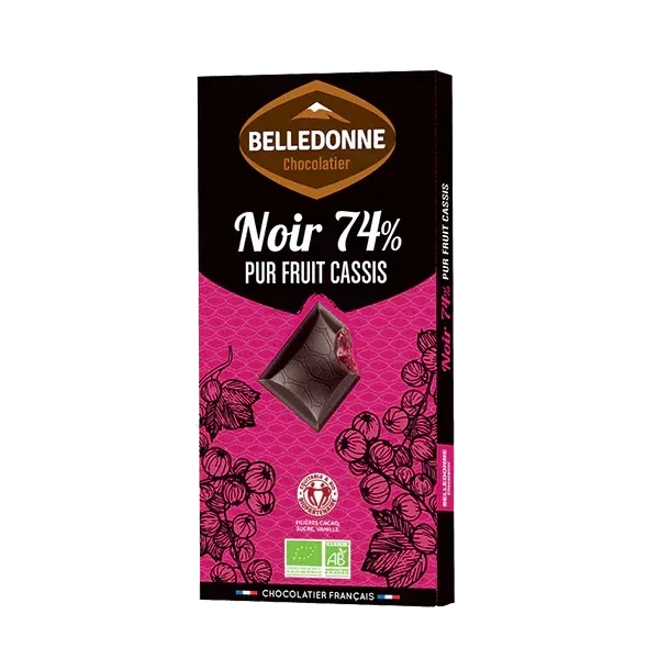 - Ingrédients : Chocolat noir (74%) (pâte de cacao, sucre de canne, beurre de cacao, émulsifiant : lécithine de soja, arôme naturel de vanille), cassis (26%)