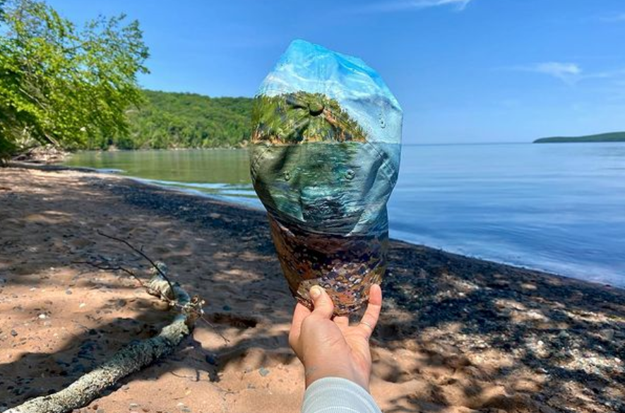Sous ses mains, une vieille chaussure en caoutchouc, une bouteille en plastique écrasée, une pelle à sable ou encore un enjoliveur se transforment en paysage, dans lequel ils se fondent grâce à un travail de superposition et à un angle choisi avec minutie lors de la prise de vue.
